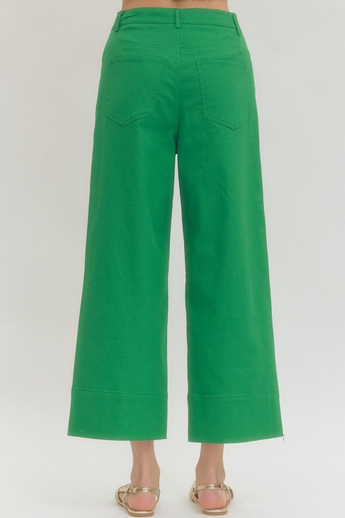 Make a bold yet timeless statement with these green wide-leg cropped pants. Designed with a flattering high-rise waist and clean, tailored seams, these pants offer a structured look with comfortable wearability. The wide-leg silhouette and cropped length create an effortlessly chic profile that works for both casual and dressy styling.
