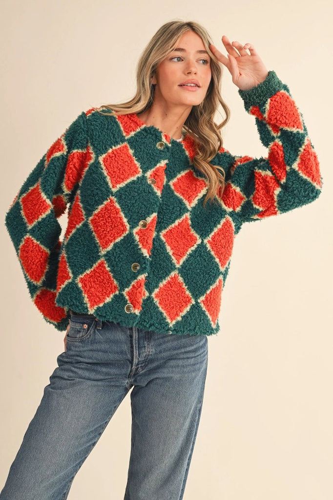 Faux Shearling Argyle Jacket, Electric Huntergreen - The Pointe Boutique