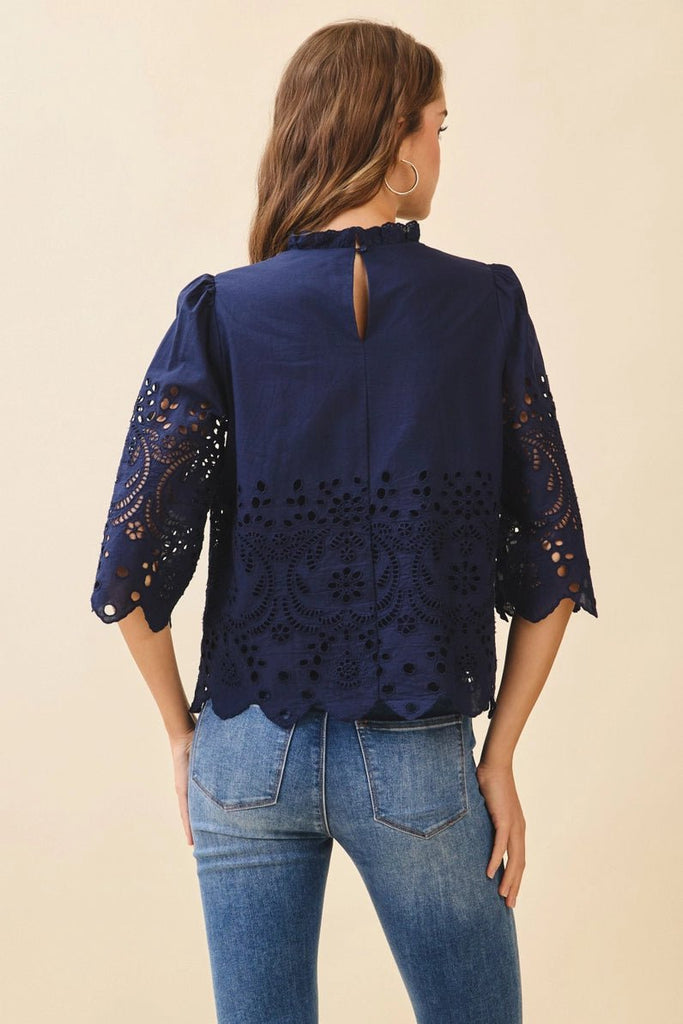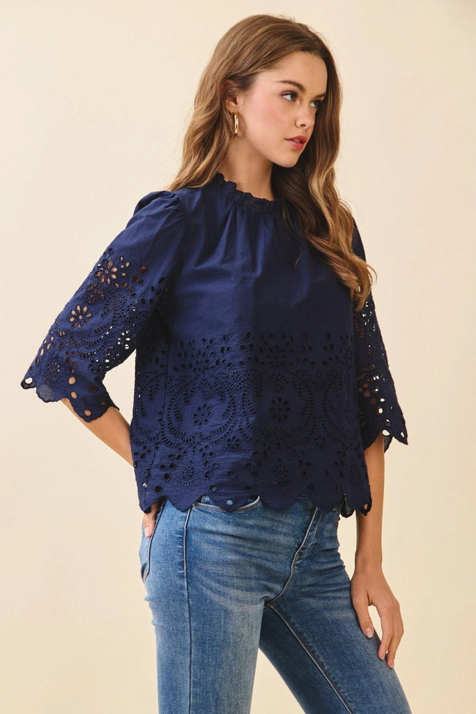 Floral Eyelet Embroidery, Solid Navy Top - The Pointe Boutique