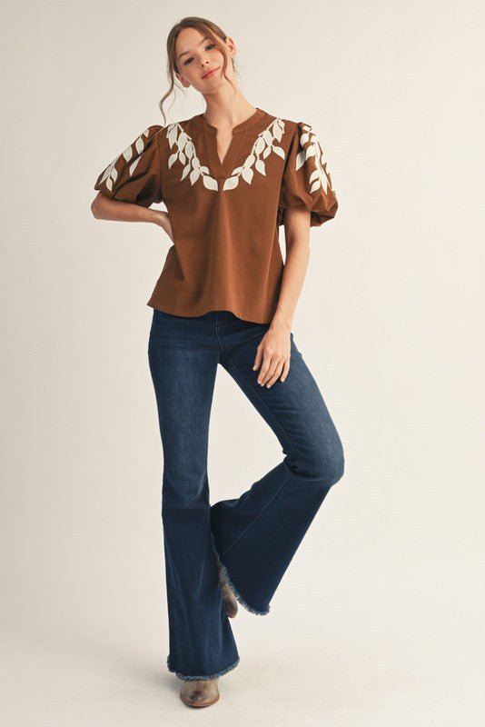 Add effortless charm to your wardrobe with this brown embroidered puff sleeve blouse. Designed with delicate ivory leaf embroidery across the neckline and sleeves, this top blends timeless elegance with a modern boutique feel. The lightweight fabric offers all-day comfort, while the relaxed fit and subtle V-notch neckline create a flattering silhouette. Soft puff sleeves add just the right amount of feminine detail, making this blouse perfect for dressing up or down.