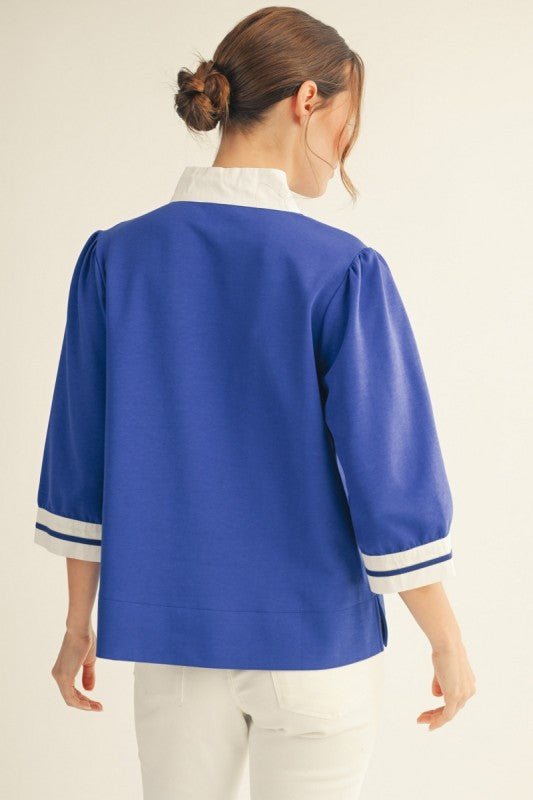 Polished, timeless, and effortlessly flattering — this contrast trim tunic top is the definition of easy sophistication. Designed in a rich royal blue with crisp white trim, this top features a tailored split neckline, structured collar detail, and relaxed three-quarter sleeves that feel refined yet comfortable.