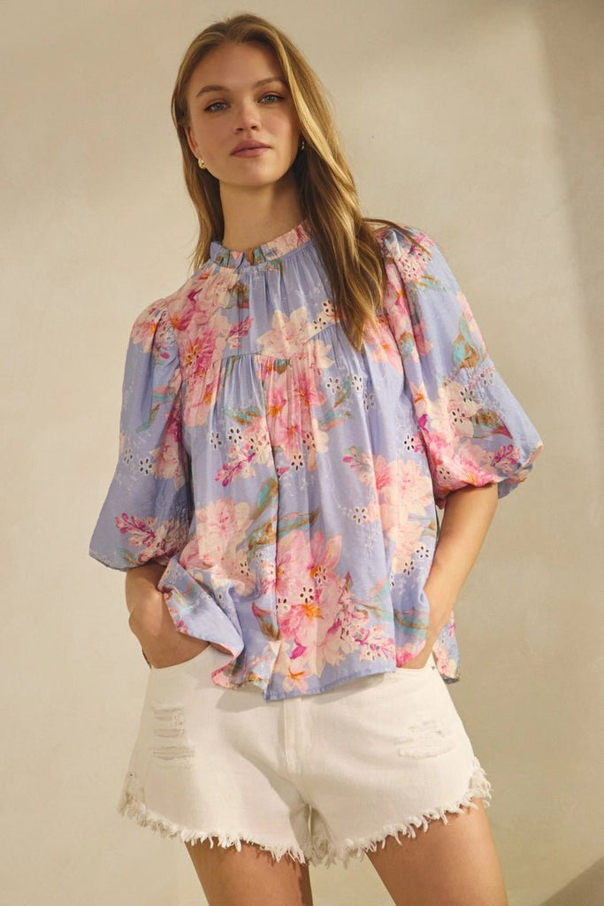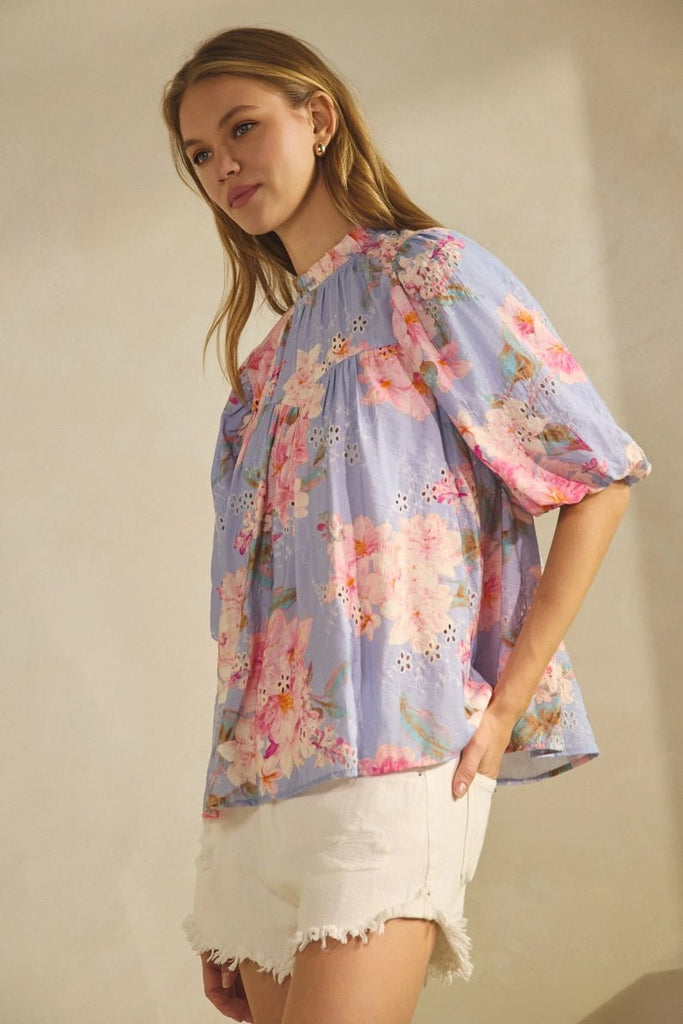 Designed with a gathered neckline and airy puff sleeves, this blouse drapes beautifully for a flattering, flowy fit. The subtle eyelet-style detailing adds texture and boutique-level sophistication.