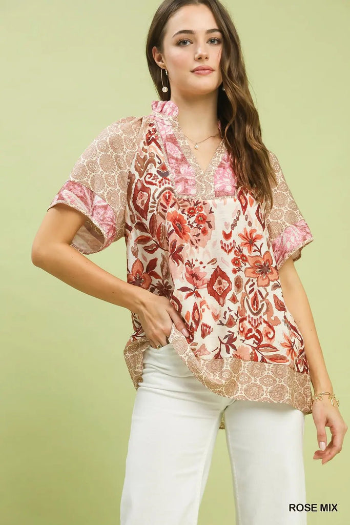 Mixed Print V-Neck Short Sleeve Rose Top