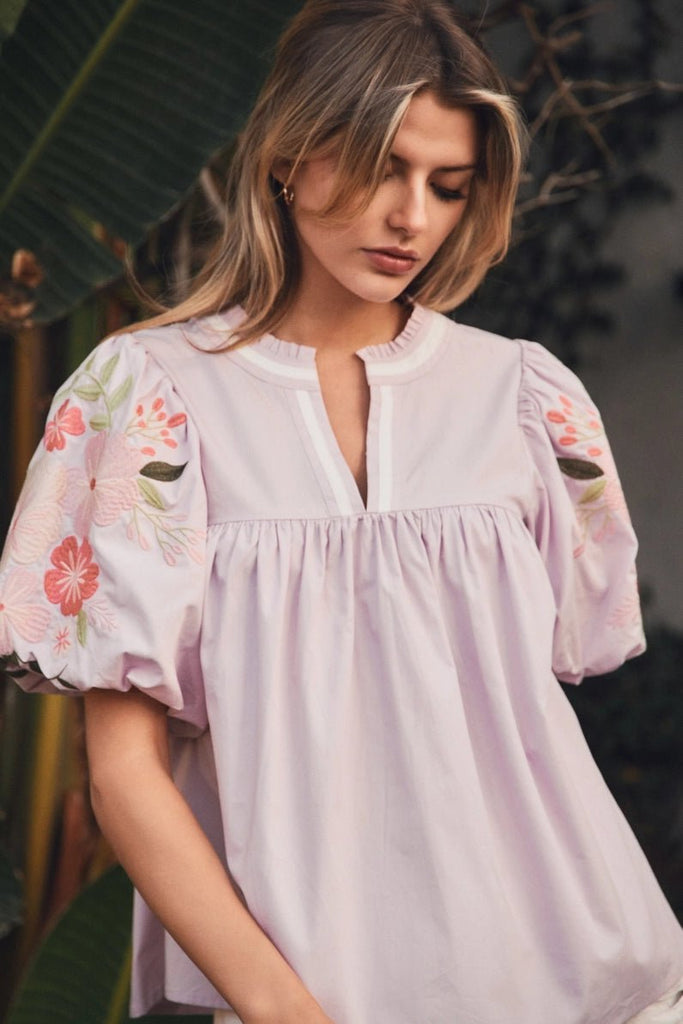 Oddi Lavender Floral Embroidered Puff Sleeve Top