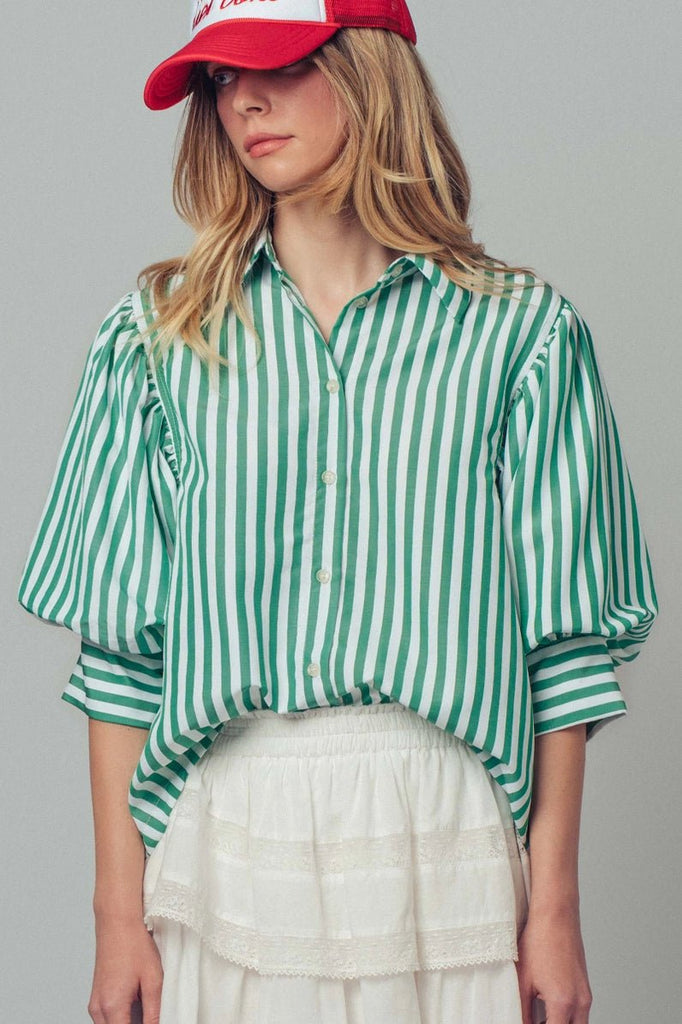 Classic stripes meet modern boutique style in this Green & White Striped Puff Sleeve Button-Down Top. Designed with a crisp vertical stripe pattern, statement puff sleeves, and a relaxed button-front fit, this top delivers an effortlessly polished look with just the right amount of personality.
